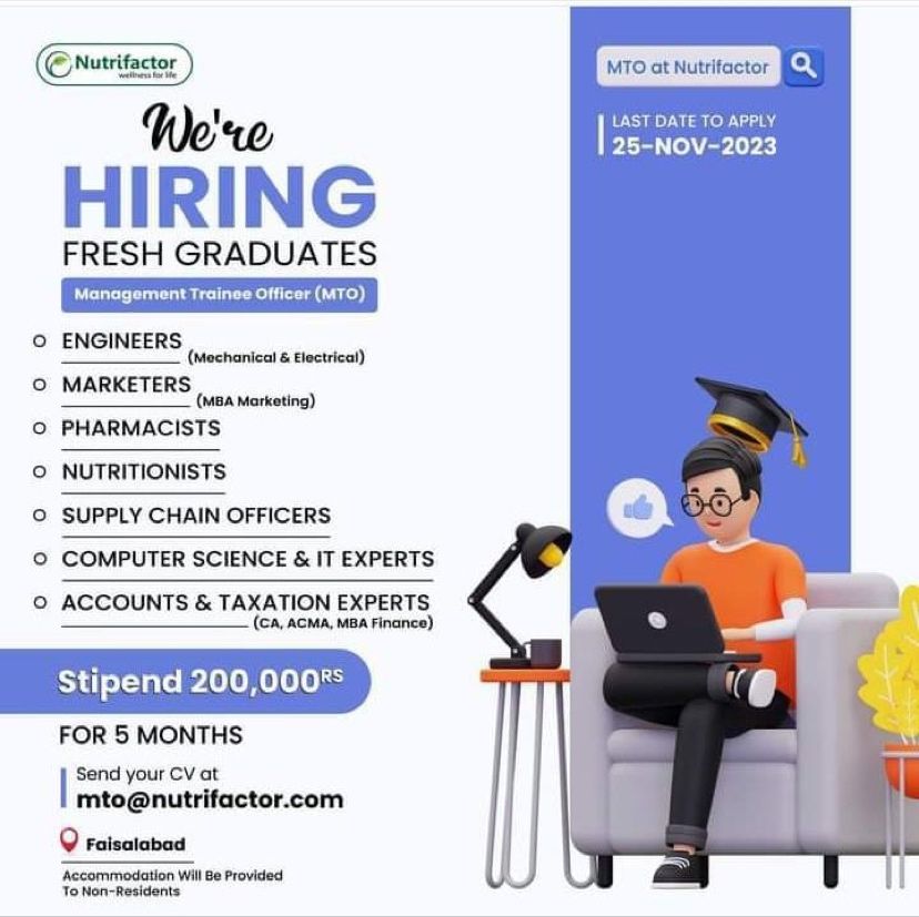 Stipend and Duration: Selected candidates will receive a competitive stipend of Rs. 200,000 for a 5-month duration. The MTO position will lead to a job, and we'll also provide accommodation facilities to employees who are not residents of Faisalabad.