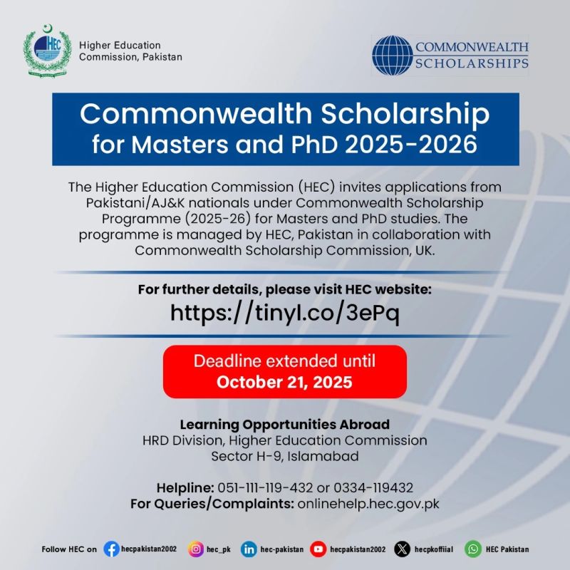 Application deadline for the Commonwealth Scholarship 2025–26 has been extended until October 21. Details at https://tinyl.co/3ePq