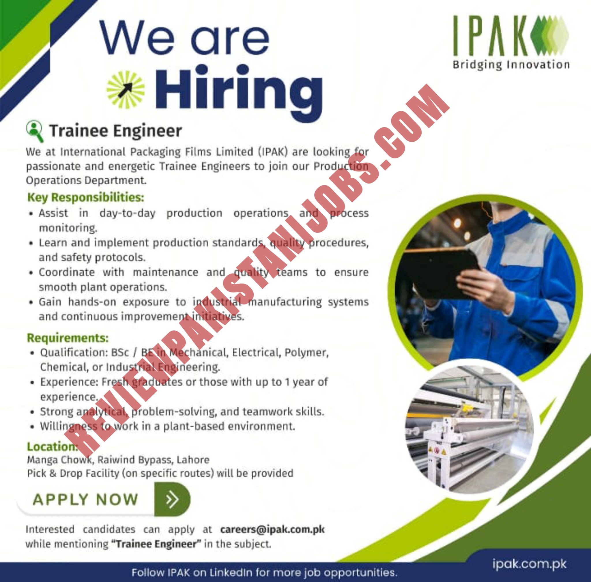 IPak Bridging Innovation is looking for Trainee Engineer Qualification: BSc/BE Mechanical, Electrical, Chemical Engineering Experience: Fresh graduate Location: Lahore Apply: careers@ipak.com.pk while mentioning "trainee Engineer" in the subject