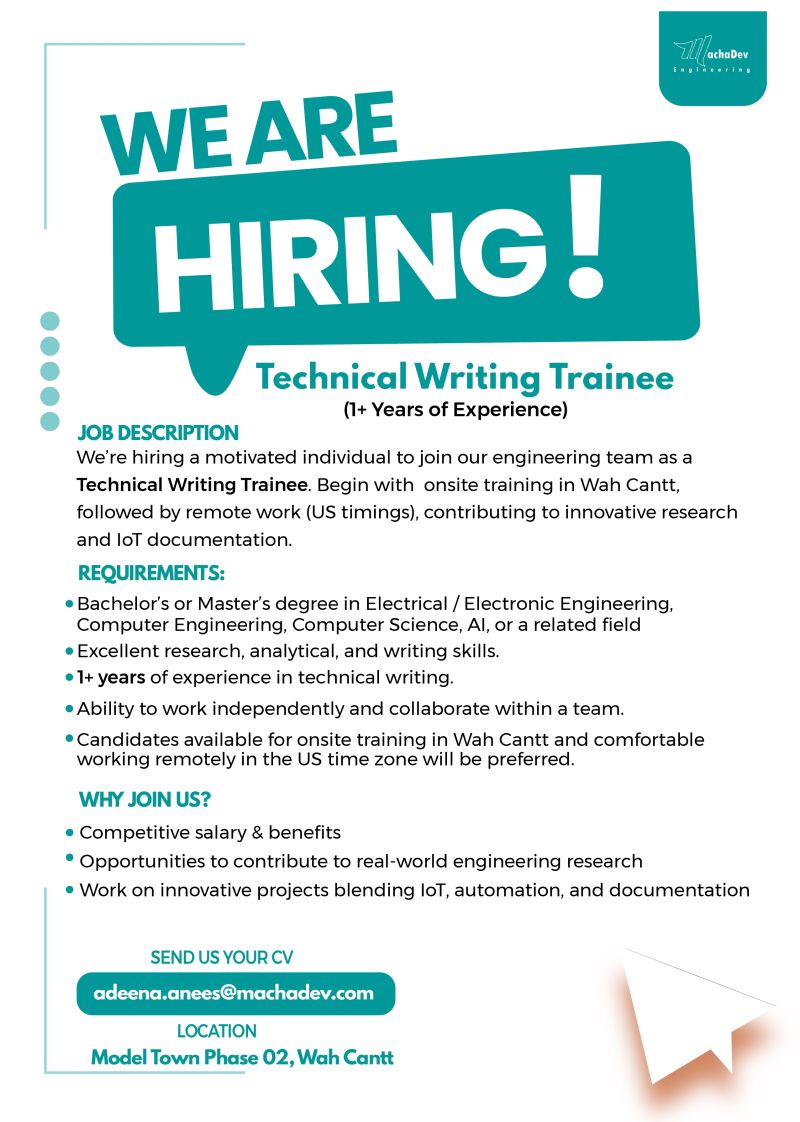 MachaDev Engineering Hiring – Technical Writing Trainee (1+ Years of Experience) MachaDev Engineering is seeking a skilled and motivated Technical Writing Trainee to join our engineering team. The role begins with onsite training in Wah Cantt, followed by remote work aligned with US time zones. Apply Now: adeena.anees@machadev.com Location: Model Town, Wah Cantt