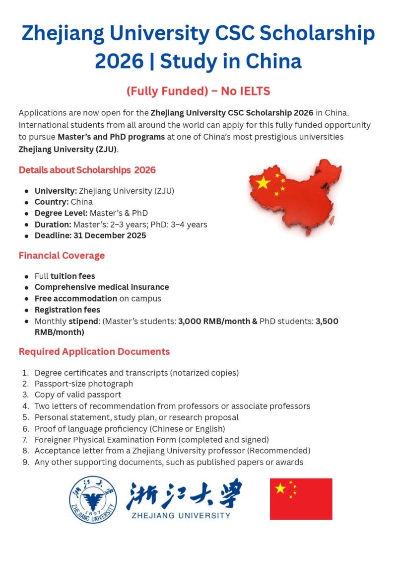Fully Funded Zhejiang University Chinese Government Scholarship 2026 Apply: https://iczu.zju.edu.cn/admissionsen/2022/0530/c68996a2590724/page.htm Study Level: Master and PhD No Need IELTS Deadline: 31 Dec 2025