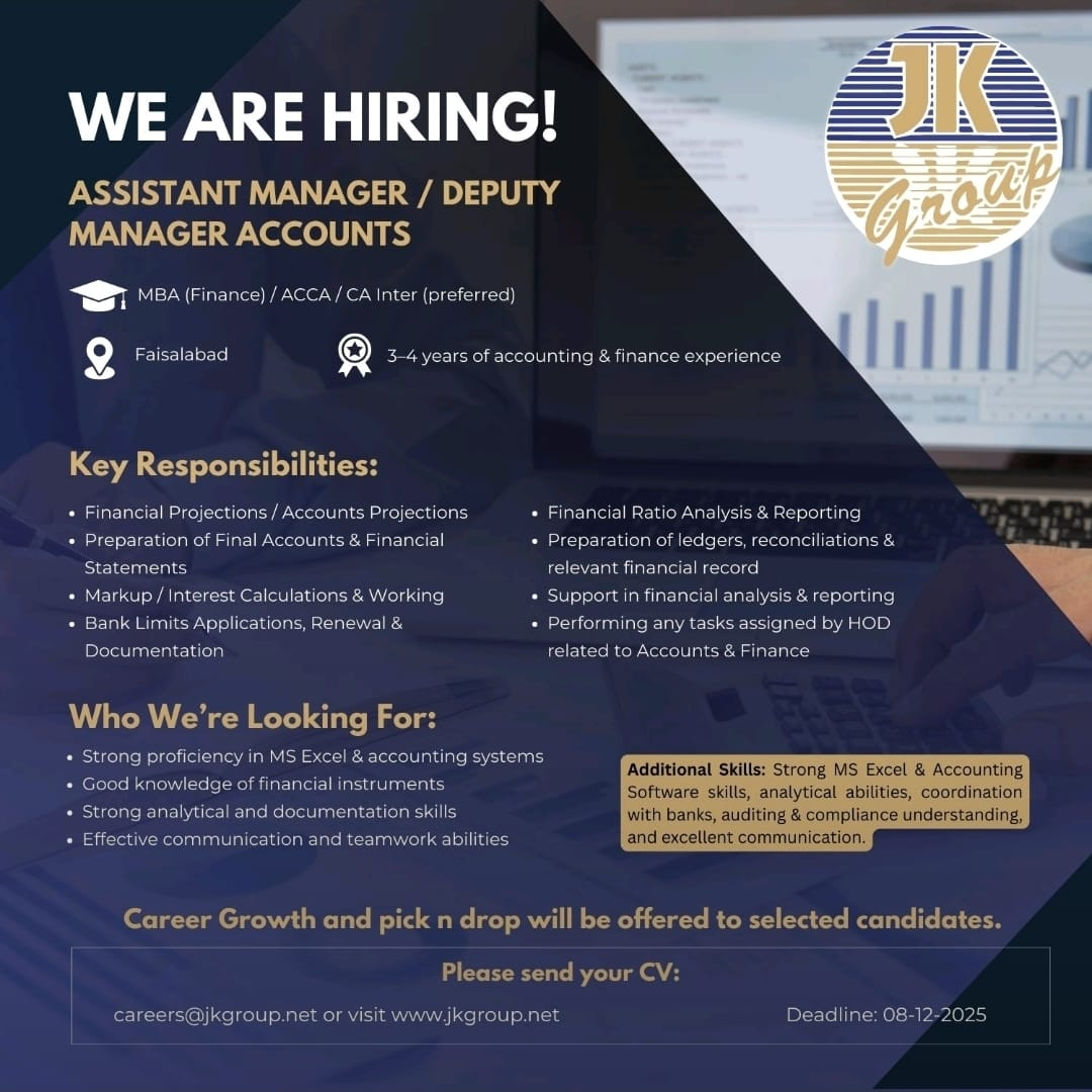 JK Group Hiring - Assistant Manager/Deputy Manager Accounts Qualification: MBA(Finance)/ACCA/CA Deadline: 8-12-2025 Apply: send CV to Careers@jkgroup.net