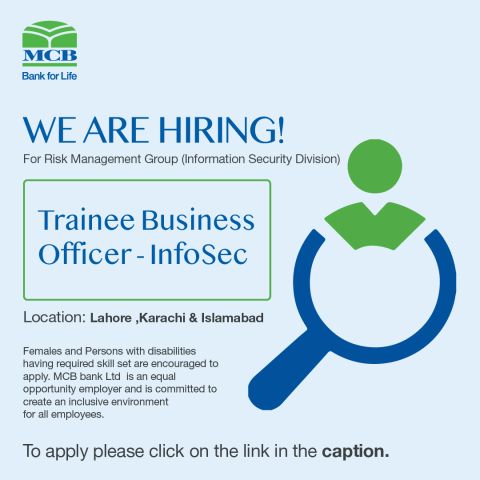 Are you looking for a career in one of Pakistan's leading Banks? The Risk Management Technology Group of MCB Bank is looking for Trainee Business Officers - Infosec to join its team of talented, motivated and highly skilled professionals.