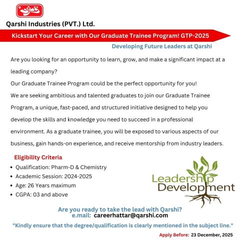 Qarshi Industries (Pvt.) Ltd. We are excited to announce an opening for the: Graduate Trainee Program (PharmD & Chemistry) Location: Hattar How to Apply: Qualified candidates are invited to submit their CV to careerhattar@qarshi.com. Please include the position title "Graduate Trainee " in the email subject line.