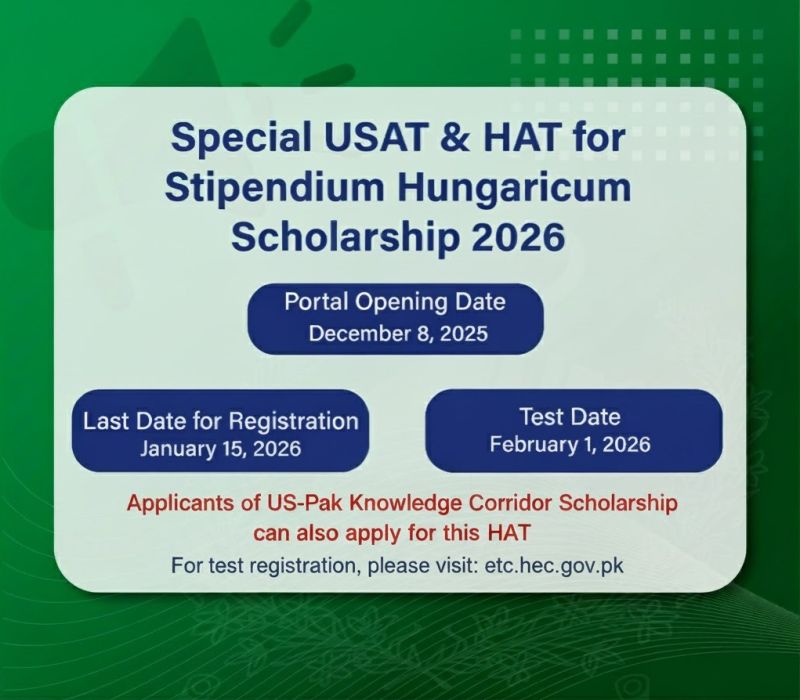 Special USAT & HAT will be held exclusively for applicants of the Stipendium Hungaricum Scholarship 2026. NOTE: Applicants of Pak-US Knowledge Corridor Scholarship can also apply for this HAT. Register now at: https://etc.hec.gov.pk/