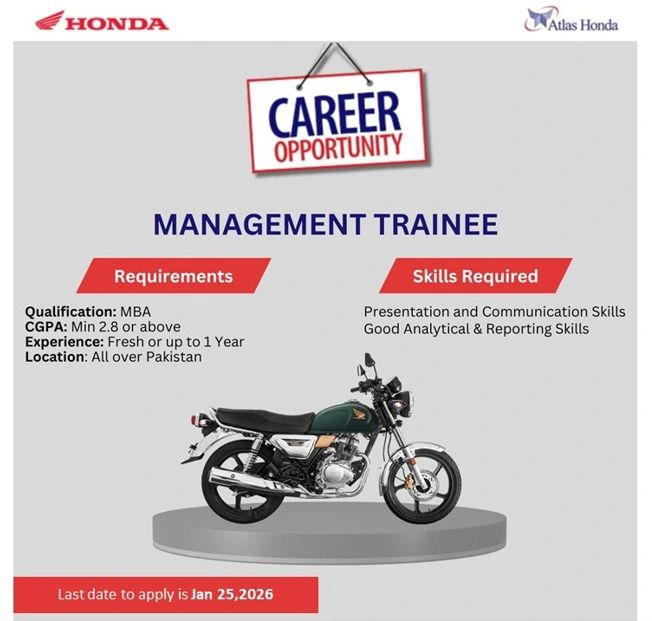 Atlas Honda Limited is seeking talented individuals for the Management Trainee - Marketing Program. Be part of a dynamic team shaping the future of the automotive industry. Fresh ideas, innovation, and growth await. Equal opportunity employer, females are highly encouraged to apply.