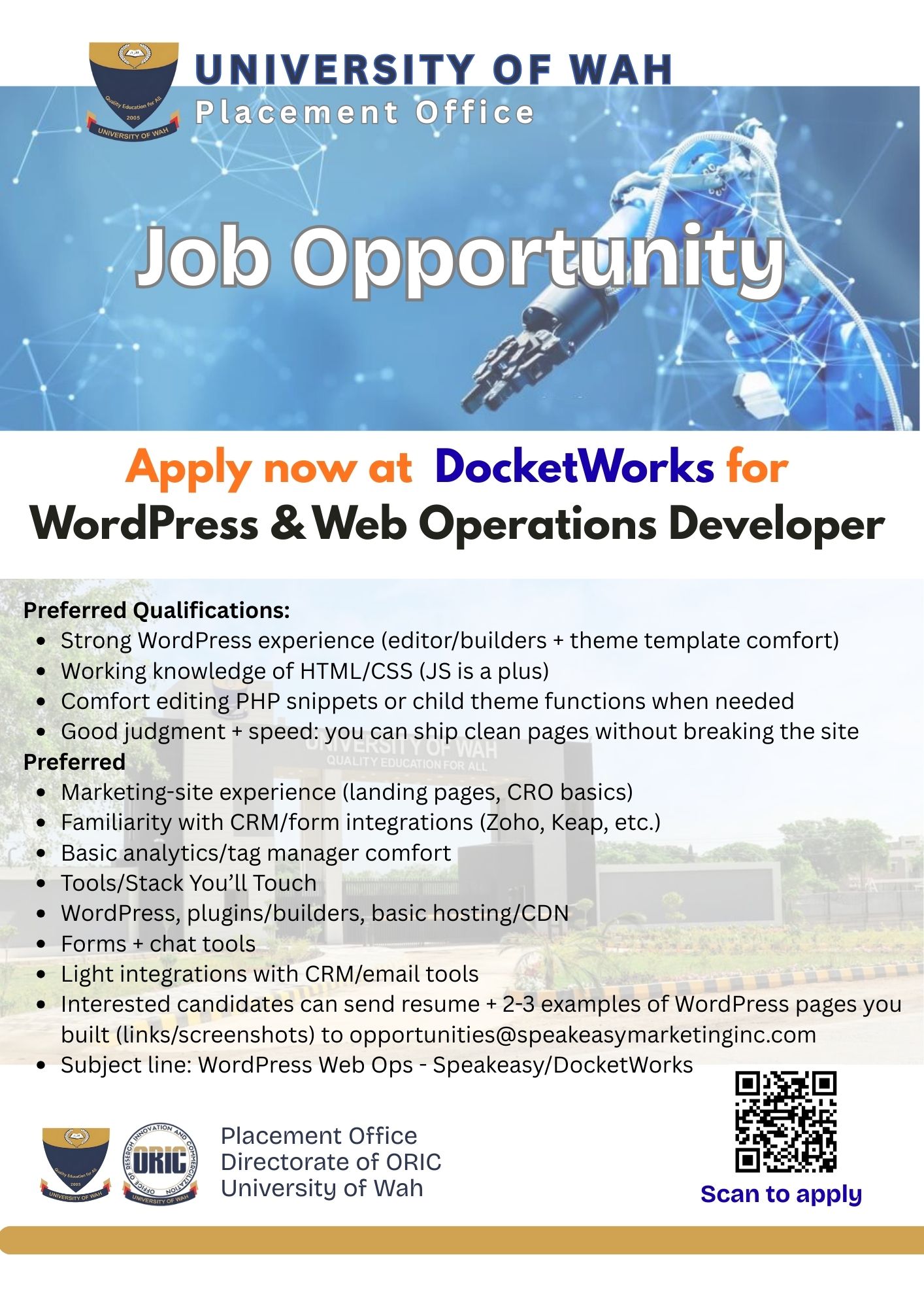 Interested candidates can send resume + 2-3 examples of WordPress pages you built (links/screenshots) to opportunities@speakeasymarketinginc.com