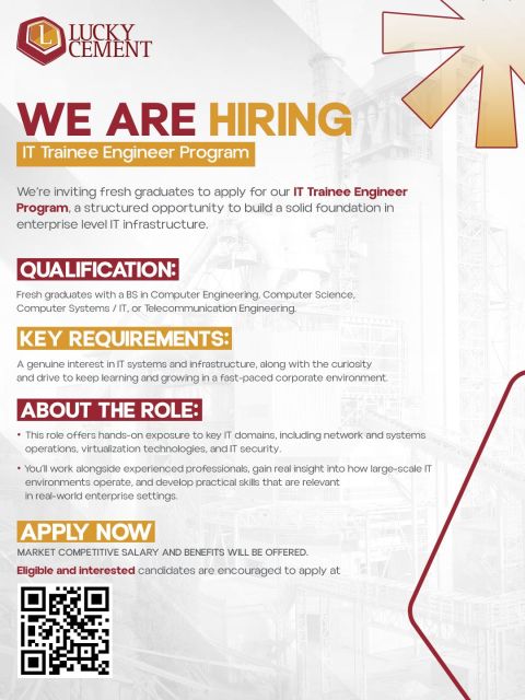 The Lucky Cement announced IT Trainee Engineer Program Apply: https://lnkd.in/d9rPKsPp