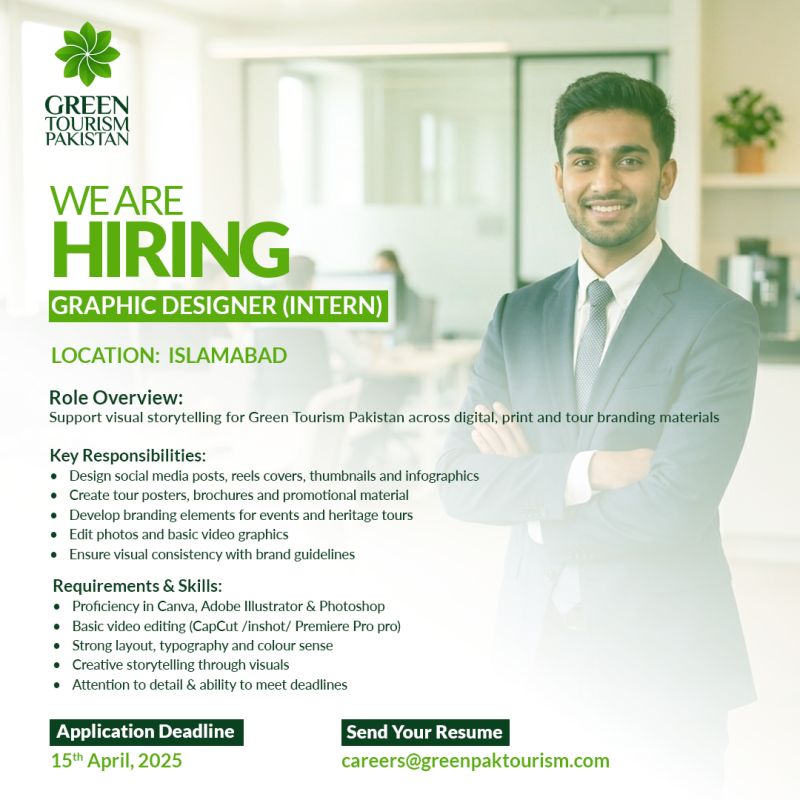 Green Tourism Pakistan We are hiring Graphic Designer (Intern) to join our team in Islamabad, we would love to hear from you. Send your resume to: careers@greenpaktourism.com Application deadline: 15th April 2025