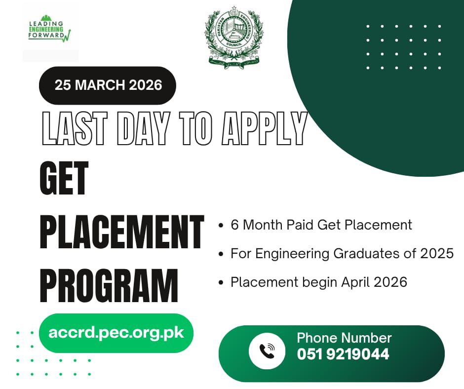 🚨 Apply Now. PEC’s Paid 6-Month GET Placement Program. If you graduated in 2025, this program offers a valuable opportunity to gain paid industry experience and take the first step toward becoming a Professional Engineer. βœ” 6-Month Paid Placement βœ” Practical Engineering Experience βœ” Professional Career Pathway πŸ“… Deadline: 25 March 2026 Don’t miss this opportunity β€” apply today. πŸ”— https://accrd.pec.org.pk/