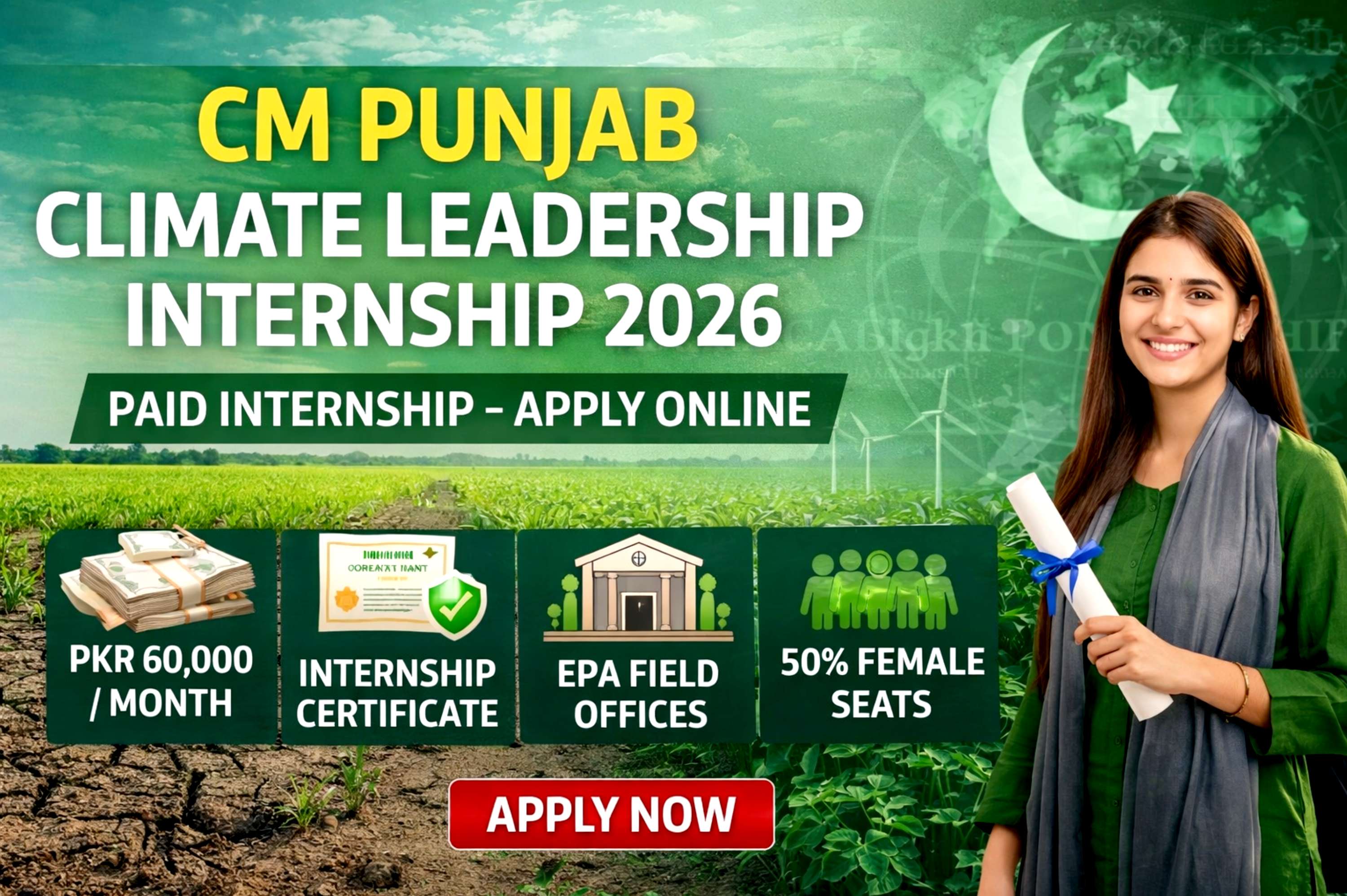 Internship Overview The Chief Minister Punjab Climate Leadership Development Internship Program (Batch-1) emphasizes the cultivation of practical skills in: • Mitigation of climate change • Environmental policy implementation • Initiatives for sustainability Interns will collaborate closely with the Environment Protection and Climate Change Department, acquiring practical governmental experience. Benefits of the Program Chosen interns will obtain: Monthly stipend of PKR 60,000 Certificate of Internship from the Government Practical experience in climate initiatives Exposure to Environmental Protection Agency field offices Training in sustainability and climate communication Fifty percent of seats are allocated for female candidates. Guidance from environmental specialists How to Apply? Adhere to the following procedures: • Access the official governmental application portal • Fill out the online application form. • Provide the necessary information and documentation • Submit your application prior to the deadline. • Ensure your application is comprehensive to prevent rejection. Important Dates 📅 Application Deadline: March 29, 2026